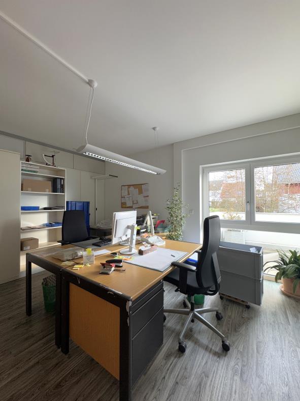 Sie lässt sich sehr flexibel und individuell nach Bedarf in kleinere Einzelräume unterteilen oder als offenes Großraumbüro verwenden. Bisher wurde die Gewerbefläche als Steuerkanzlei genutzt: Das Unternehmen hat dafür die benötigten Zweier- und Dreier-Büros durch das Aufstellen deckenhoher Schrankwände geschaffen, mit dem Doppeleffekt des zusätzlichen Stauraums.